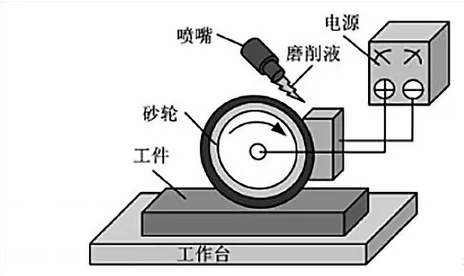 在線電解修整(Electrolyticin-processdressing,ELID)鏡面磨削技術是一種低成本高效率的超精密鏡面加工技術,廣泛應用工程陶瓷、硬質合金、光學玻璃、玻璃陶瓷、單晶硅等超精密陶瓷加工領域中。對于硬脆材料及難加工材料,ELID鏡面磨削技術作為一種高效的鏡面加工技術,將取代傳統的研磨拋光工藝進行精密鏡面加工。其工作原理見下圖及下文解析。